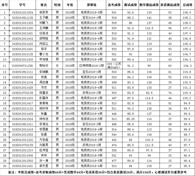 2018级勘技创新班考核成绩前30名既拟录用学生公示名单