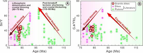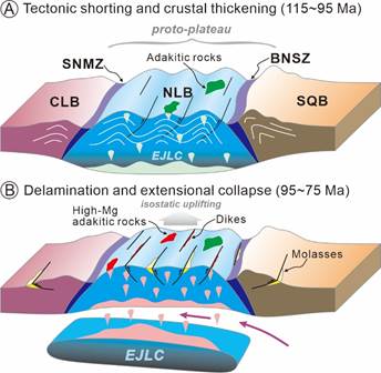 本文以藏北狮泉河地区广泛发育的花岗质岩脉为主体研究对象,在详细的野外地质调查基础上,通过系统的地质年代学、地球化学和大陆动力学的研究,取了如下认识:1)大规模岩脉的出现,结合锆石U-Pb定年结果与区域同期磨拉石建造的出现,揭示拉萨-羌塘碰撞在晚白垩世处于碰撞后造山垮塌阶段;2)全岩主微量元素与Sr-Nd同位素地球化学组成,结合锆石原位Lu-Hf同位素特征,表明狮泉河花岗质岩脉起源于深部新生代的变火成岩下地壳部分熔融;3)综合对比研究表明拉萨-羌塘碰撞带于晚白垩世同步发生了地表隆升、岩石圈减薄以及高Mg埃达克质岩浆的爆发,研究认为晚白垩世负责构造-岩浆活动是碰撞后增厚榴辉岩相下地壳拆沉的产物,而深部拆沉过程引发的均衡反弹导致了原高原的造山垮塌过程。该研究不仅对限定青藏高原早期抬升过程提供了重要的约束,同时对理解碰撞造山带构造-岩浆演化具有一定的启示意义。