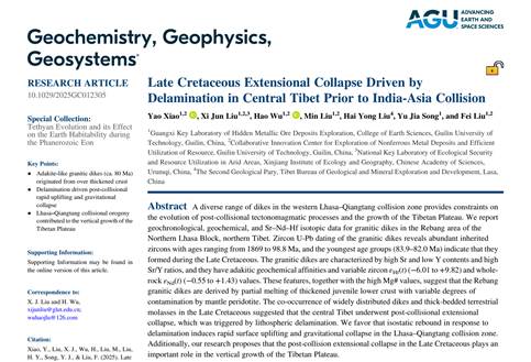 Xiao, Y., Liu, X. J., Wu, H., Liu, M., Liu, H. Y., Song, Y. J., & Liu, F. (2025). Late Cretaceous extensional collapse driven by delamination in central Tibet prior to India‐Asia collision. Geochemistry, Geophysics, Geosystems, 26, e2025GC012305. https://doi.org/10.1029/2025GC012305.