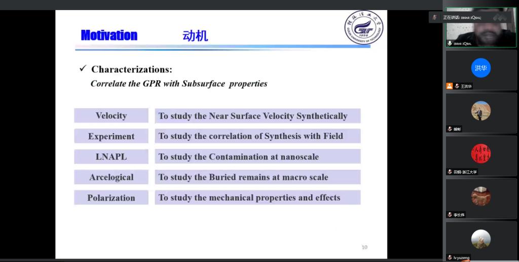 IBRAR IQBAL博士做了题为《APPLICATONS OF GROUND PENTRATING RADAR FOR WATER CONTAMINATION, VELOCITY EXPLORATION AND ARCEALOGICAL INVESTIGATIONS》的报告。报告内容聚焦探地雷达在地下水污染探测、浅地表结构和岩性调查中的应用研究,采用连续小波变换、卷积神经网络等方法获取浅地表地下结构分布,并通过数值模拟、物理模拟和实测案例验证了方法的有效性。评委专家对IBRAR IQBAL博士在站期间的研究工作表示了认可,并提出了建设性的意见。最后经答辩委员会专家投票表决,一致认为IBRAR IQBAL博士达到了博士后出站要求,同意出站。
