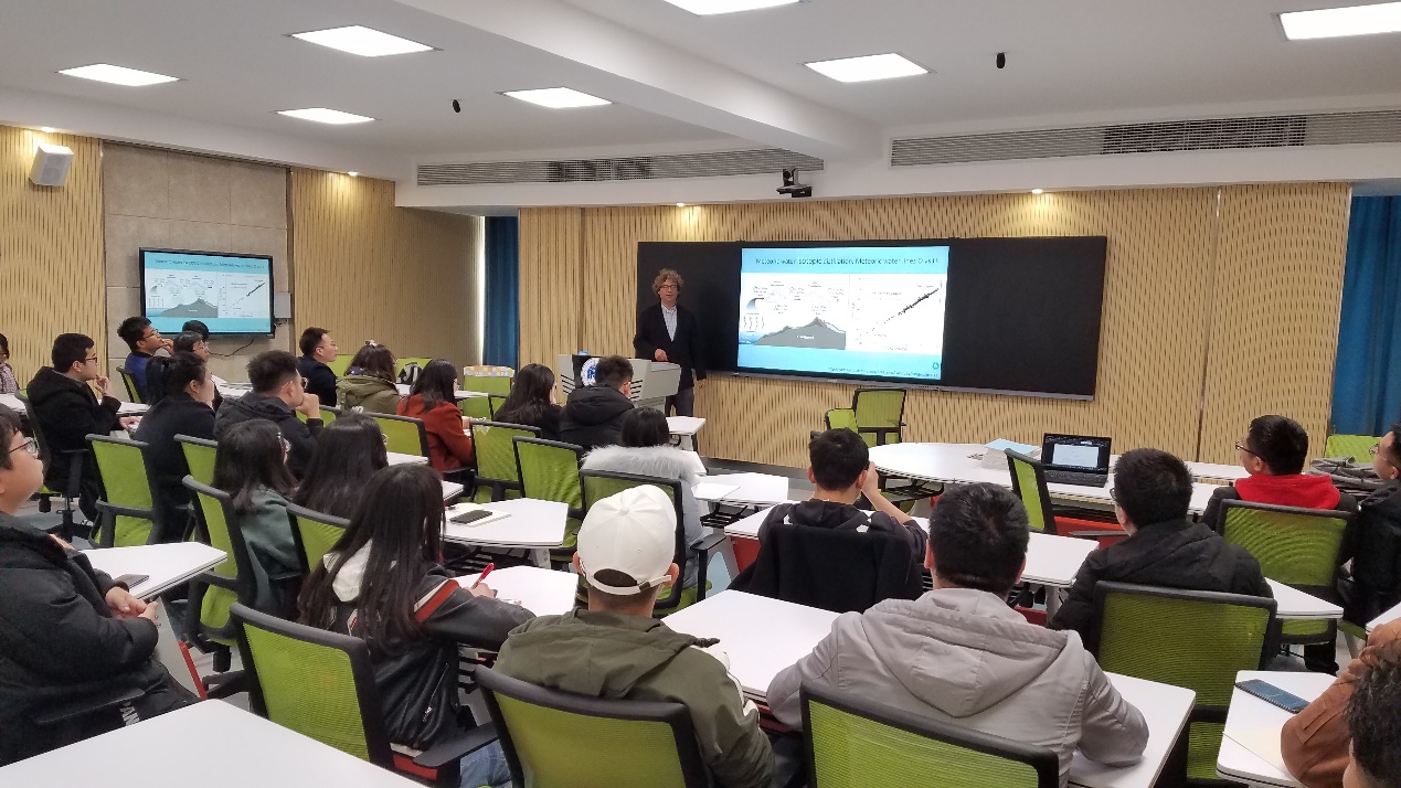 报告会上,Ilya Bindeman教授首先阐明现代河流粘土粒级沉积物的三氧同位素组成与风化母岩类型无关而主要受控于大气降水δ18OMW值,因此其能够较真实地反映地表温度、δ18OMW和δ17OMW值。随后,Ilya Bindeman教授以地质历史时期页岩为研究对象,阐述了三氧同位素在示踪太古代时期大陆表壳快速暴露风化剥蚀、现代水圈循环启动和冰期等重要地质事件中的有效运用。同时,Ilya Bindeman教授还介绍了俄勒冈大学稳定同位素实验室的仪器设备和测试精度以及该校海外留学生情况,鼓励师生们到该校学习与交流。