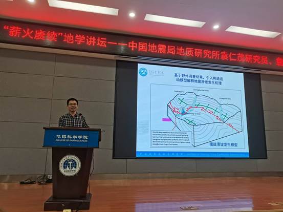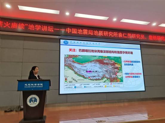 袁仁茂研究员首先作了题为《地震滑坡区域规律及单体机制》的报告,以汶川地震产生的海量滑坡灾害入题,介绍了地震滑坡概念、研究热点和前沿,从地震滑坡灾害的区域分布规律以及单体滑坡灾害的形成机制两方面进行了详细分析和论述,让大家对地震滑坡灾害有一个总体性的认识。随后,詹艳研究员作了题为《巴颜喀拉地块东部三维深部电性结构及强震深部孕育环境》的报告,展示了近期在巴颜喀拉地块东部获取的不同尺度沿断层带多个地段的介质电阻率结构,分析该区大型断裂带分段物性结构和断裂活动性以及变形特征关系,解剖巴颜喀拉地块东部的多个强震的发震构造特征。最后,教育中心副主任吴妍萍进行了研究生招生宣讲,对中国地震局地质研究所的历史沿革、学科优势和特色、研究方向,以及研究生学习生活情况做了详细介绍,鼓励我院学生报考。