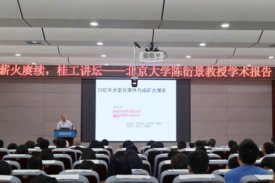 报告会上,陈衍景教授作了题为《23亿年大氧化事件及成矿大爆发研究进展》的报告,他首先从为什么研究23亿年大氧化事件的想法出发,详细阐述了如何具体开展研究、研究过程中遇到的困难,寻找解决方案等科学研究经历。随后聚焦华北克拉通,详细介绍了华北克拉通大氧化事件的5大标识,23亿年大氧化事件与华北克拉通矿产资源大爆发之间的起因及序列,以及团队在这一研究领域取得的成果。陈衍景教授的丰硕学术成果及科研经历点燃了广大师生科研热情,其独特的科研思维方式对青年教师和学生进行科学研究具有重要借鉴意义。