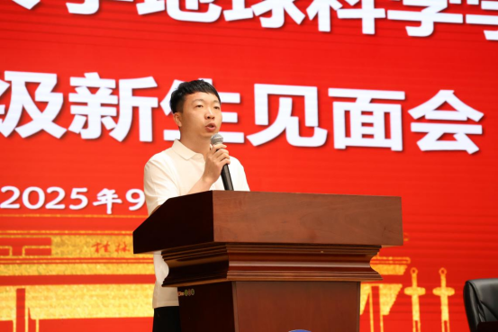 2025级本科新生张钰嘉作为新生代表上台发言,她表示要立志将秉承老一辈地质学家们的宏伟志向,肩负起新时代青年的责任使命,为建设美丽中国、宜居地球贡献自己的智慧和力量。