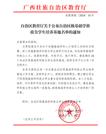 近日,广西壮族自治区教育厅正式公布了自治区级基础学科拔尖学生培养基地名单。bv伟德国际1946申报的“地质学拔尖学生培养基地”成功入选。本次基地获批不仅标志着自治区对学院地质学科前期建设基础的认可,更对学院未来地学人才培养工作提出了更高期望。