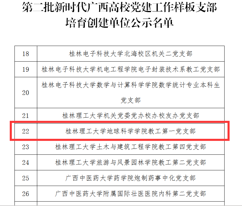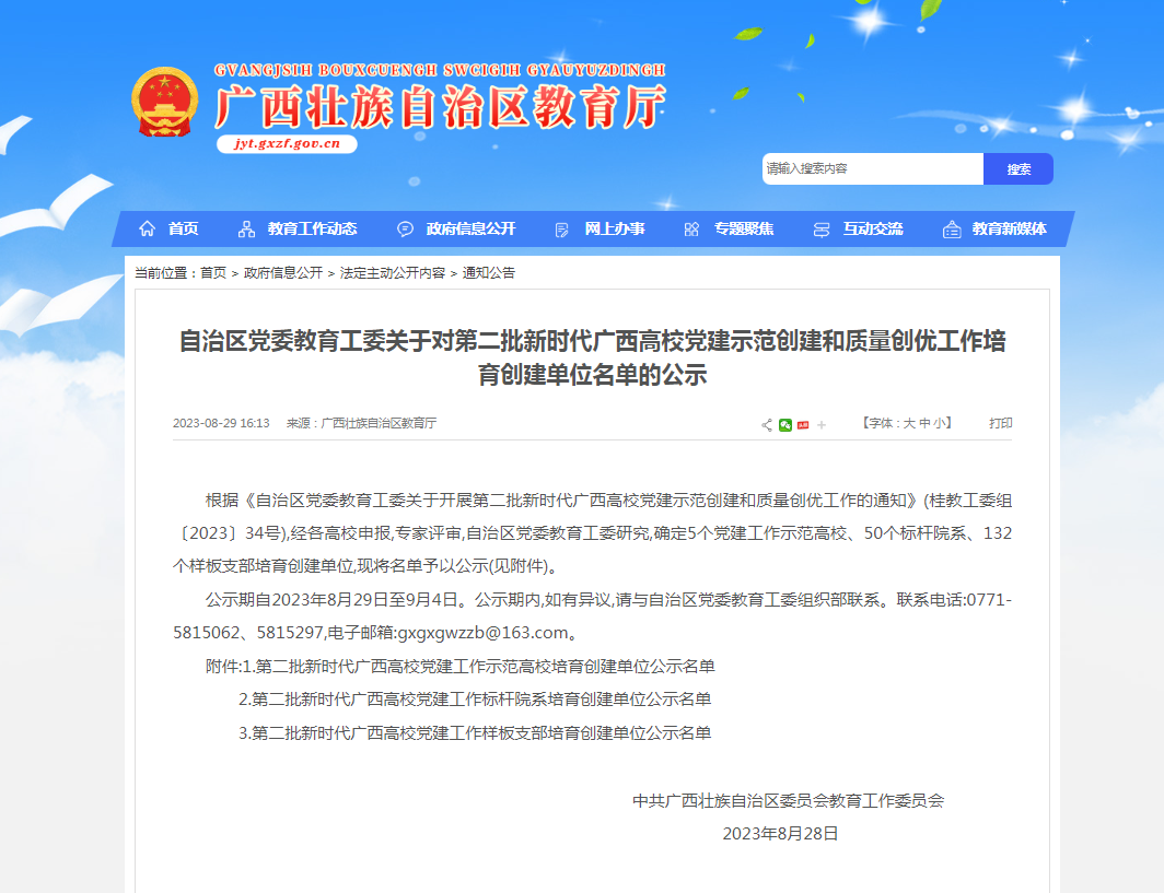 近日,自治区党委教育工委公布了第二批新时代广西高校党建示范创建和质量创优工作培育创建单位的名单,确定了5个党建工作示范高校、50个标杆院系、132个样板支部培育创建单位。我院教工第一党支部成功入选第二批新时代广西高校党建工作样板党支部培育创建单位,实现继2019年12月教工第五党支部入选全国党建工作样板党支部以来学院基层党建工作再次取得突破性成果。
