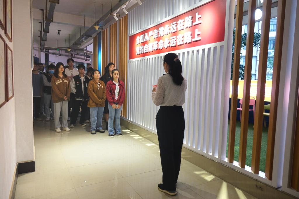 逸夫楼“廉政文化长廊”主要由荷花主题文化墙、廉政简史宣传栏、廉政文化学习区、廉政书画墙四部分组成。其中,廉政简史宣传栏采用图文解说的形式,依次展示了1921年至今36个廉政历史大事件,在学院组织员吕思慧的领学下,同学们驻足观看、认真聆听,在一个个宣传板前仔细详读,于润物无声中沐浴廉洁清风,将廉洁清正的理念内化于心。