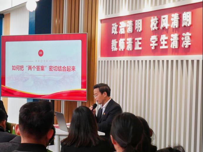 学校党委常委、纪委书记韦学敏对bv伟德国际1946的清廉建设工作表示认可和赞许,对bv伟德国际1946廉政文化长廊创造性、创新性、示范性的模式打造给予了高度评价,并在廉政文化长廊给在场师生上了一堂别开生面的“沉浸式”现场主题微党课。党课上,韦学敏以《领悟“两个答案”、捍卫“两个确立”、做到“两个维护”、紧跟伟大复兴领航人踔厉笃行,全面推进中华民族伟大复兴》为题,深入阐释了习近平总书记关于清廉文化建设的重要论述,重温了历史上毛泽东与黄炎培著名的“延安窑洞对”,讲述了如何跳出治乱兴衰的历史周期率。韦学敏指出,毛泽东同志在延安的窑洞里给出了第一个答案,这就是“只有让人民来监督政府,政府才不敢松懈”。经过百年奋斗特别是党的十八大以来新的实践,习近平总书记又给出了第二个答案,这就是自我革命,我们要在实践中正确领悟人民监督和自我革命之间的辩证关系,充分发挥两大答案的独特优势。“党的自我革命”是习近平总书记对中国共产党跳出历史周期率实践探索的最新概括,是习近平新时代中国特色社会主义思想中具有标识意义和原创性贡献的重大科学论断,具有重要的理论价值和实践意义。