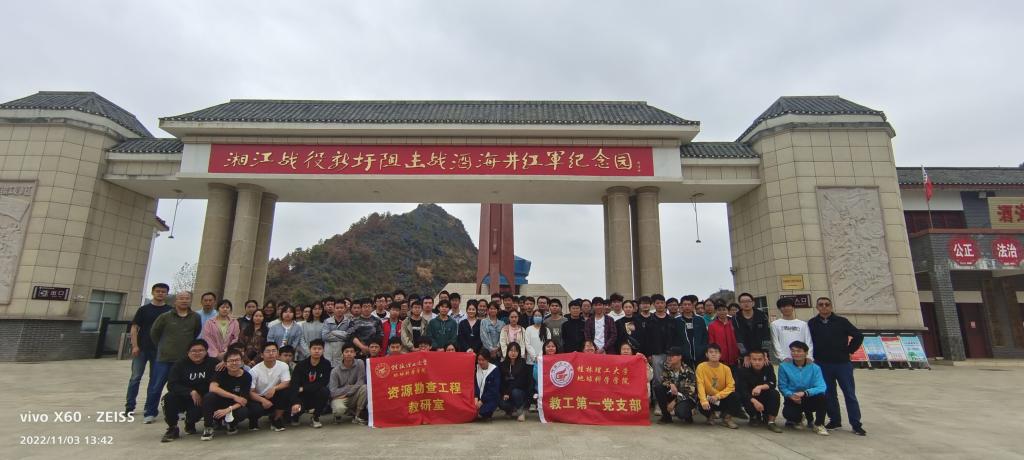 为深入学习贯彻落实党的二十大精神,充分发挥红色文化铸魂育人功能,引导学生传承红色基因,赓续红色血脉,坚定爱党护党跟党走的决心信心,11月3日,bv伟德国际1946教工第一党支部组织资源勘查工程专业20级学生参观灌阳湘江战役新圩阻击战酒海井红军纪念园。