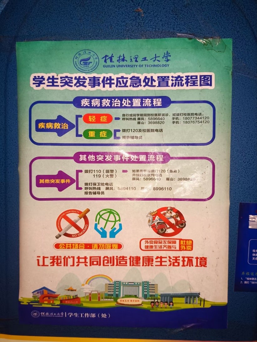 根据我校《学生突发事件应急处置流程图》,对疾病救治处理和其他突发事件处置做了详细的说明,制定了具有可操作性的应急体制。并将校医院、校保卫处、辅导员的联系电话明确标示,建立畅通的信息报送渠道。确保一旦出现突发情况,学生能够快速反应、有效处理,筑牢学生社区安全防线。