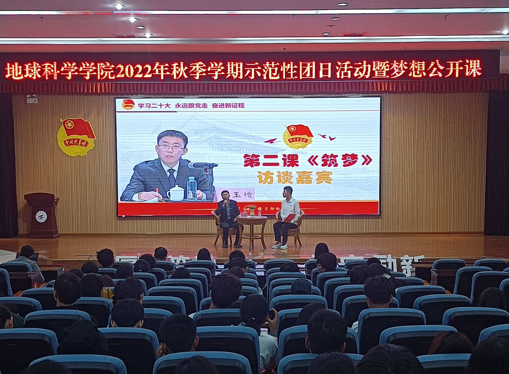 为庆祝党的二十大胜利召开,深入学习贯彻习近平新时代中国特色社会主义思想,激励青年砥砺奋发、勇毅前行,积极学习习近平总书记给山东省地矿局第六地质大队全体地质工作者重要回信精神,引领地院学子深入领悟“地质精神”的时代内涵,以“英雄地质队”为榜样,传承优良作风,奋力谱写社会主义现代化国家崭新篇章。2022年10月28日晚,我院于雁山校区图书馆报告厅开展“学习二十大,永远跟党走,奋进新征程”示范性团日活动暨梦想公开课。广西三一〇核地质大队副大队长、总工程师罗桥花、学院党委副书记陶剑飞、学院副院长吕玉增、教工第五党支部书记杨锋、学院团委书记吴田波、团委副书记王成瑞、组织员吕思慧及各班级团支部代表、团员代表出席本次活动。