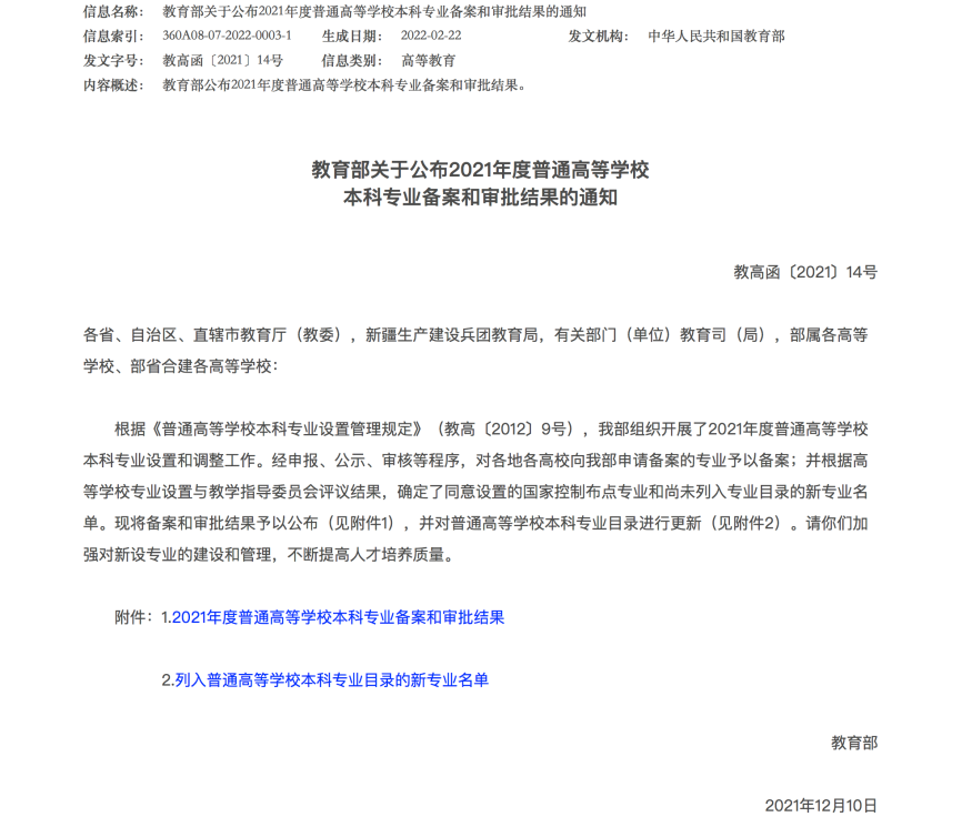 教育部关于公布2021年度普通高等学校本科专业备案和审批结果的通知