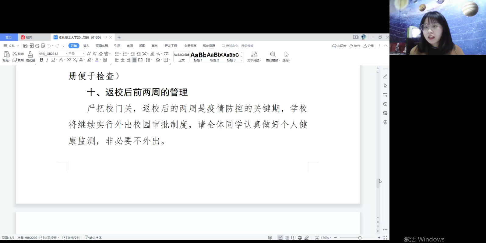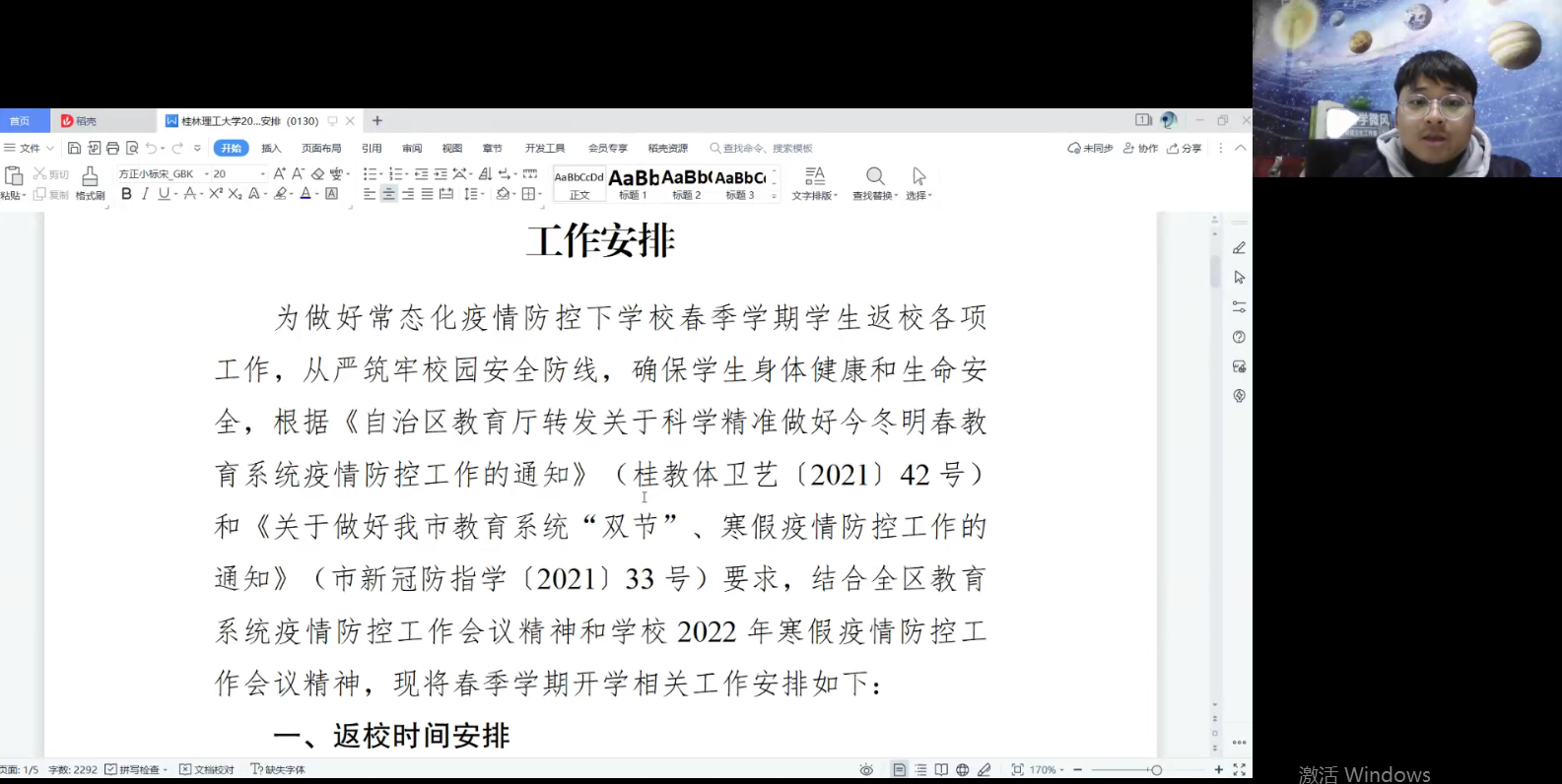 为扎实有序地推进学生安全返校,确保常态化疫情防控下学生春季返校各项工作顺利开展,根据《自治区疫情防控指挥部办公室关于做好2022年春季学期开学返校工作的紧急通知》(桂新冠防指办〔2022〕36号)精神和《关于做好桂林市各级各类学校2022年春季学期开学疫情防控工作的通知》(市新冠防指学〔2022〕4号)、《关于做好桂林市当前疫情防控工作的紧急通告》(市新冠防指学〔2022〕5号)要求,并结合学校总体部署及相关会议精神以及学院学生工作实际。bv伟德国际1946第一时间迅速反应多次部署,召开学生工作专项部署会,建立、落实“第一责任人”制度。会后,各年级辅导员根据会议精神,于2月23-24日期间先后利用腾讯会议、钉钉、QQ视频等方式召开线上年级会议及主题班会,认真传达和布置了学校学院的返校相关文件通知精神与工作要求,有力落实开学疫情防控教育工作,为新学期学生工作开好局奠定坚实的基础。