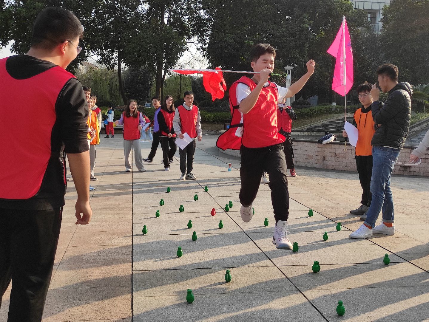 本次素质拓展活动根据新民主主义革命时期、社会主义革命和建设时期、改革开放和社会主义现代化建设新时期、中国特色社会主义新时代四个不同历史时期,分为了“重走长征路”“携手奋斗路”“摸石头过河”“奋进新时代”四个主题环节。“重温长征路”环节,队员们通过同心协作控制小球的走向,重温革命先辈们走过的万里长征路,在协同合作中深刻体会革命先辈的艰辛。“摸石头过河”项目,队员们在指定区域闭上眼睛穿越雷区,让大家知道因为革命先辈给出的经验,才让我们更易分清应该走哪条路。“奋进新时代”环节,队员通过单腿跳的方式,跳到投掷线处,手持沙包,向准靶盘中心进行投掷,回顾了革命先辈打仗时的艰辛岁月。“携手奋斗路”环节则是让每位队员认识到合作的重要性,单丝不成线,独木不成林,国家的富强和民族的复兴需要我们一代又一代人的努力付出。