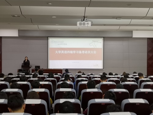 陶剑飞老师首先在会上从英语学习的重要性、什么是大学英语四级、英语四级与大学生的重要关系等三个方面为学生做动员讲话,她从英语在国际社会的重要作用,以及英语学习的国际形势,讲明了通过英语四级考试对于大学生未来发展的重要意义。她鼓励全体同学要端正态度,积极备考,把四级考试当成是对自己学习态度的一次检验,从通过英语四级开始,一步一步的努力实现自己人生的目标。