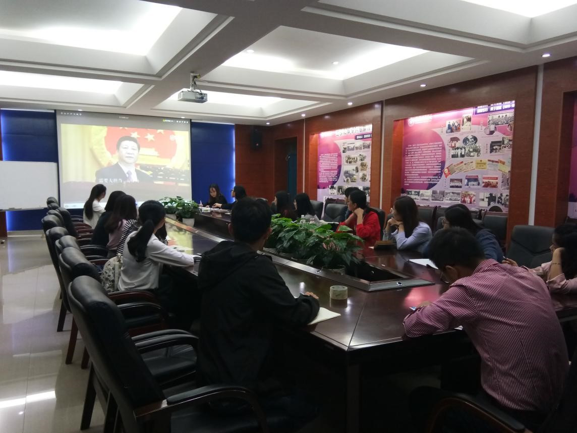 会议开端,吴田波老师带领同志们重温中共党的十九大在京召开时间、党的十九届一中全会选举习近平、李克强、粟站书、汪洋、王沪宁、赵乐际、韩正为中央政治局常委等内容。接着整个支部一起观看党的十九大宣传片,整个视频向我们展示了在党的领导下我国所取得的成就,人们过上美好生活,逐步走上小康生活。看完视频,吴田波书记与我们共同解读党的十九大八个明确和十四个坚持,新时代、新矛盾、新目标、新思想及会上把习近平新时代中国特色社会主义思想写入党章等内容。