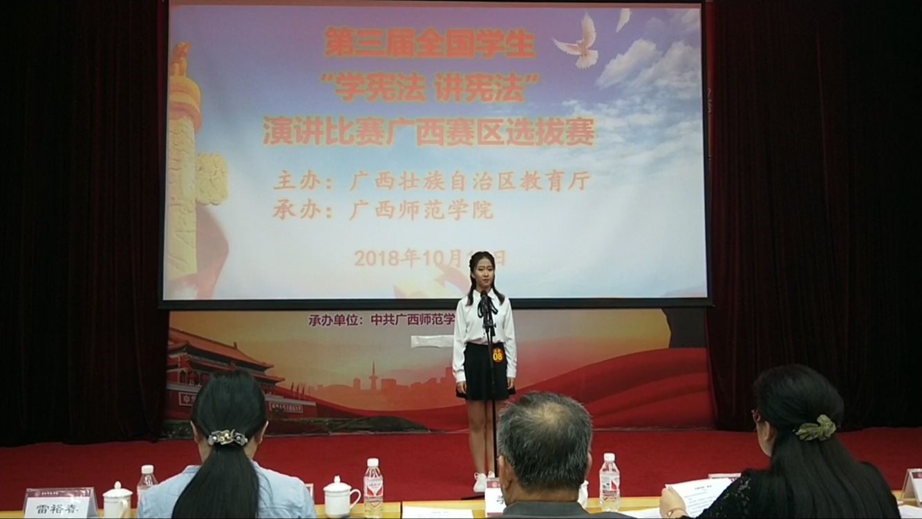 为深入贯彻党的十九大和十九届二、三中全会精神,贯彻习近平新时代中国特色社会主义思想,认真落实深入学习宣传和贯彻实施宪法的有关精神,按照中宣部、中组部、全国人大常委会办公厅、教育部、司法部《关于组织开展宪法学习宣传教育活动的通知》要求,经过选拔,我院资勘17实验班芦思洁,代表我校参加广西区比赛,取得总成绩第二的优异成绩。11月26日在南宁接受赛事集训后,加入广西代表队参加第三届全国“学宪法 讲宪法”活动全国总决赛,与全国其他省市学子共同切磋学习。广西代表队在庆祝广西壮族自治区成立60周年之际,参赛选手展现自我,一争高下,在总决赛中取得三等奖的好成绩。