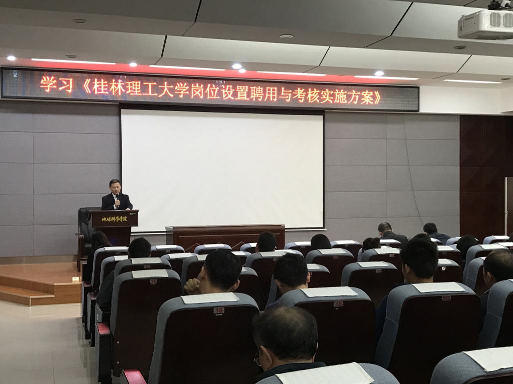 10月23日下午,我院组织全体教职工在雁山校区逸夫楼01501报告厅召开大会,集中学习《伟德国际1946手机岗位设置聘用与考核实施方案》,大会由熊彬院长主持。
