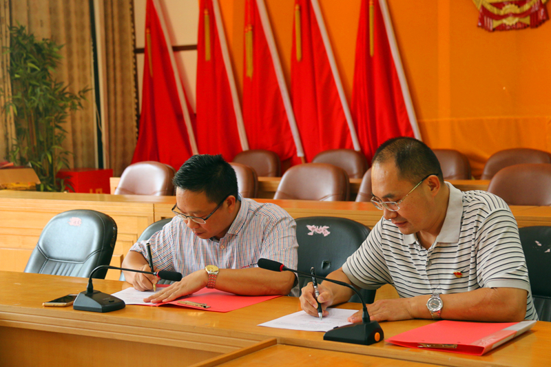 仪式伊始,杨镇长对三门镇的人文地理,资源特色及经济状况等作出详细介绍。三门镇位于龙胜县西南部,面积约为310平方公里,约1.5万人口,是一个工业重镇。森林覆盖率高,环境优美。矿产资源以滑石为主,还有鸡血玉等矿产资源。三门镇作为龙胜贫困各族自治县的一份子,今年计划实现全面脱贫三个贫困村以力争摘帽。其次,杨镇长叮嘱同学们在社会实践活动过程中注意个人安全,谨防溺水。会上,耿书记向杨镇长介绍我校校史校情,提出将定期进行社会实践,长期对接贫困户求学儿童进行帮扶,并感谢三门镇人民政府对学院社会实践活动的支持。最后,耿书记与杨镇长进行签约仪式,共同为基地揭牌。