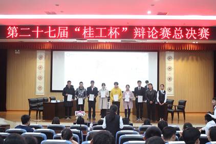 伟德国际1946手机第二十七届“桂工杯”辩论赛决赛于2017年12月24日15:00在雁山校区图书馆报告厅举行。本次比赛由校学生会主办,我校14级辩论队副队长磨鑫松、主力蔡青青、广西师范大学漓江学院辩论队15级队长涂艳玲、伟德国际1946手机博文管理学院辩论队15级副队长林琮竣作为嘉宾出席本场辩论赛并担任本场比赛的评委。