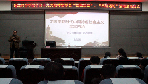 随后,耿书记为大家做题为《习近平新时代中国特色社会主义思想丰富内涵》的十九大精神学习报告会。现场首先通过十九大会后的采访视频,使同学们更全面地了解十九大的内容、内涵。接着,耿书记从“八个明确”、“十四个坚持”具体阐述习近平新时代中国特色社会主义思想丰富内涵。耿书记还联系学院这几年的发展历程以及个人的经历,向同学们阐述了自身对于十九大精神的理解,即“不忘初心,不懈奋斗,自信自强”。在会议最后,耿书记语重心长地对在座学子说:“希望同学们都努力学习,和地院一起,奋发图强,敢于拼搏,勇于创新,为新时代中国特色社会主义道路,奉献自己的一份力量!”。报告会赢得在场学子们热烈掌声。