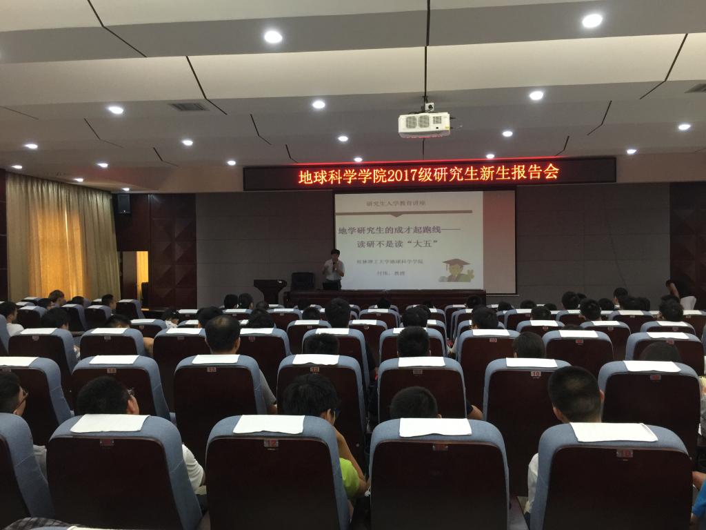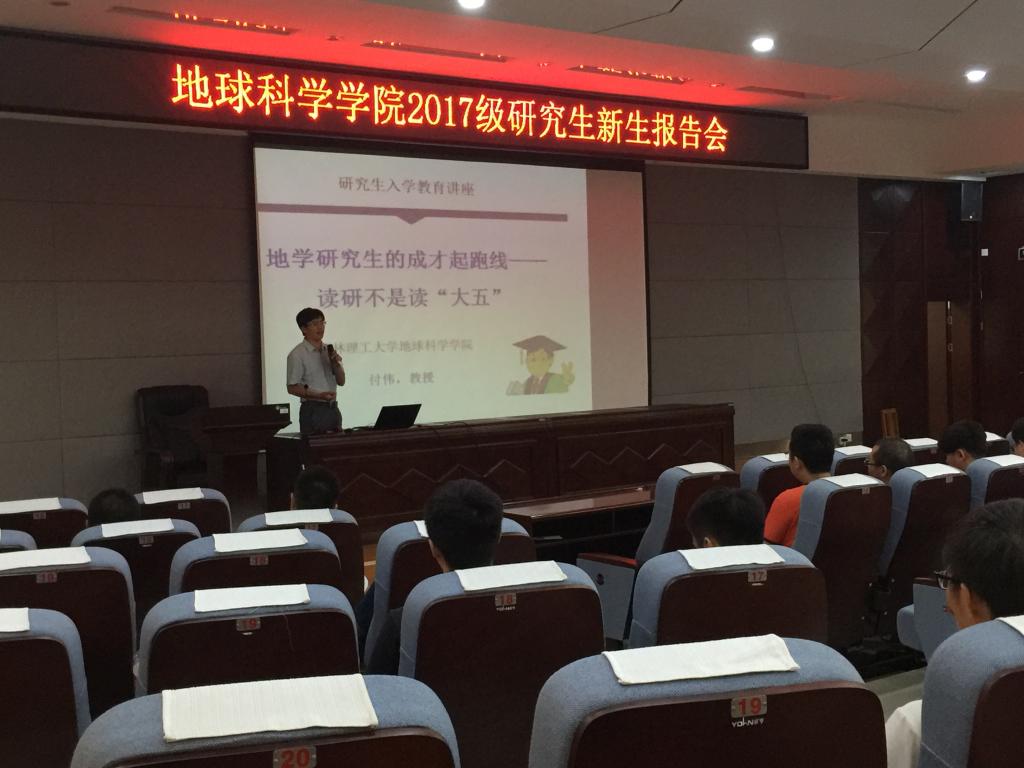为帮助我院研究生新生尽快适应新的学习和生活,顺利完成从本科生到研究生的转变,更好的规划自己研究生生涯。9月28日下午3:00,在逸夫楼01501学术报告厅,地学院举行了一场别开生面的研究生新生入学教育报告会,由我院博士生导师付伟教授为2017级研究生新生主讲了题为《地学研究生的成才起跑线:读研不是读“大五”》的报告,学院2017级全体研究生新生及研究生会学生干部与会聆听了本次讲座。