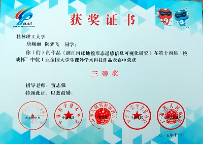 11月16至20日,第十四届“挑战杯”中航工业全国大学生课外学术科技作品竞赛终审决赛在广东工业大学举行。我院贾志强老师指导的《漓江河床地貌形态遥感信息可视化研究》获得全国三等奖。