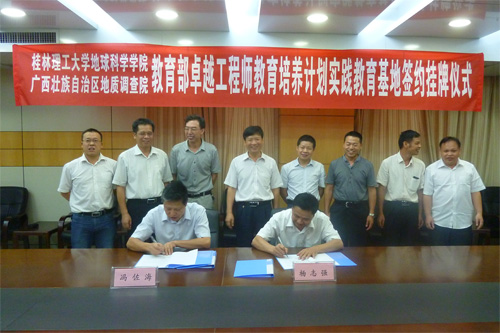 7月25日下午,解庆林校长率校办主任邓国彬,我院冯佐海院长、缪秉魁副院长等一行走访了广西地质调查院,双方签订了教育部卓越工程师教育培养计划实践教育基地协议书,并举行了基地揭牌仪式和外聘指导教师聘书颁发仪式。