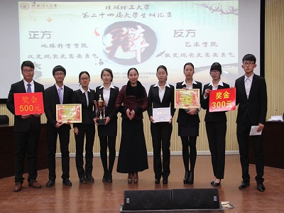 以辩为友,荟萃桂工英才;以辩为师,独领论坛风骚。经过一个月的激烈角逐,十四个学院的精彩对抗,最终,在伟德国际1946手机第二十四届大学生辩论赛中,我院与艺术学院脱颖而出。2014年12月23日晚19:10,伟德国际1946手机第二十四届大学生辩论赛闭幕式暨总决赛在雁山校区图书馆报告厅举行。本场比赛中,双方就“改变现实更需要勇气还是接受现实更需要勇气”展开讨论。团委老师官红艳以及十四个学院主席学习部部长出席了此次本场比赛。