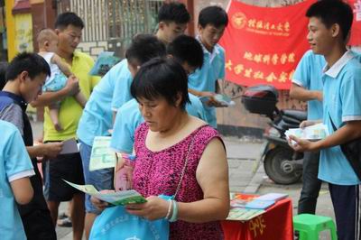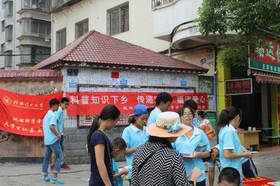 7月15日上午,我院大学生社会实践团在学院团委书记蒋琼老师和辅导员莫长庆老师的带领下于桂林市灵川八里街中心广场展开科普知识宣传的工作。其中包括防震知识小百科,艾滋、结核等疾病的预防、以及基本的农田水土保持法以及水道管理条例等。