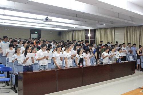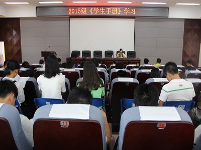 入学初期,为加强新生们的爱校教育,学院鼓励大家积极主动学唱校歌,并组织大家统一学习《学生手册》,使爱校的种子入学时便深深埋下。积极向党组织靠拢是当代大学生先进性的重要表现,为提高大家对党的认识,了解入党流程,学院还精心组织进行了入党启蒙教育讲座。