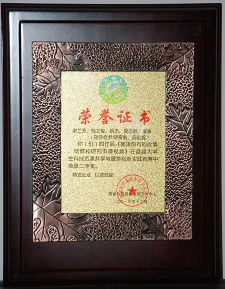 日前,在国家科技基础条件平台中心主办的首届“共享杯”大学生科技资源共享与服务创新实践竞赛中,由我院研究生谢兰芳等提交的《南极陨石的收集、馆藏和研究申请视频》荣获大赛二等奖,我校为唯一一所二等奖以上非国家211和985获奖高校,也是广西唯一一所获奖高校,缪秉魁教授和陈宏毅老师获优秀指导教师奖。本次大赛,共收到来自全国各高校和科研院所选送的参赛作品416件。