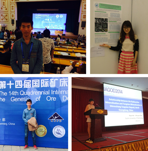国土资源部成矿作用和资源评价重点实验室主任暨大会主席毛景文先生致开幕词,并作了“Exploration progressin China in the 21st century”大会主题学术报告。我院二年级研究生周旻玥和李培荣同学在分会场分别作了题为“Discuss the relationship between the radioactive mineralization and tungsten mineralization in Shirenzhang Tungsten deposit,North Guangdong,China”和“Fluid Inclusions and Rare Earth Elements of the Badu Gold Deposit, Guangxi, China: Implications for Mineralization”的学术报告,反响热烈。