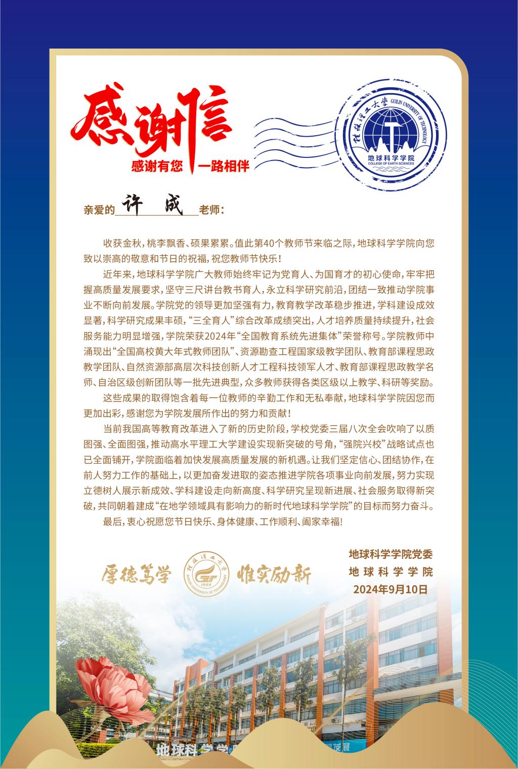 一封贺信送祝福。教师节期间,学院党委和行政向全体教师发出来感谢信,并制作祝福卡片。信中回顾了近年来在全体教师共同努力下学院所取得的成绩,对学院全体教师为学院发展所倾注的智慧和力量、奉献和心血表示了崇高的敬意和衷心的感谢,并致以节日的问候。