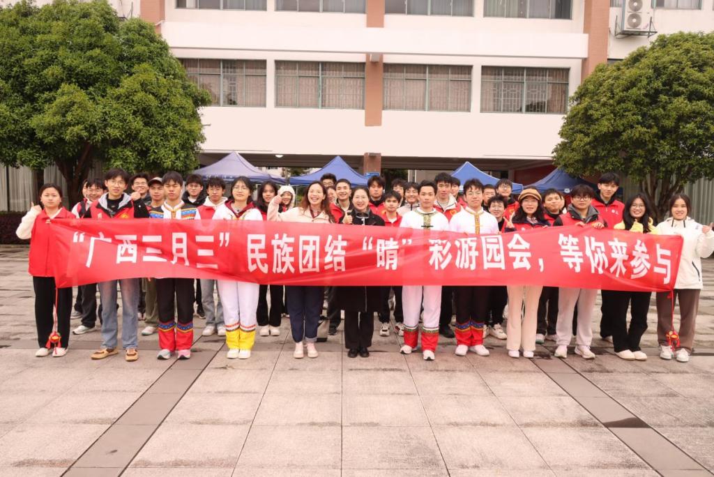 为不断促进各族学生的交往交流交融,大力弘扬广西壮乡“三月三”优秀传统文化,让中华民族共同体意识根植各族学生的心灵深处,增进民族文化认同感,增强相互理解和团结合作的意识,进一步丰富校园文化活动载体形式。2025年3月29日上午,bv伟德国际1946在雁山校区三栋广场举办“广西三月三”民族团结“睛”彩游园民俗体验活动。