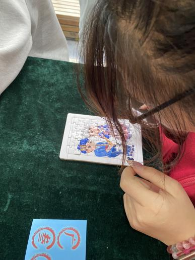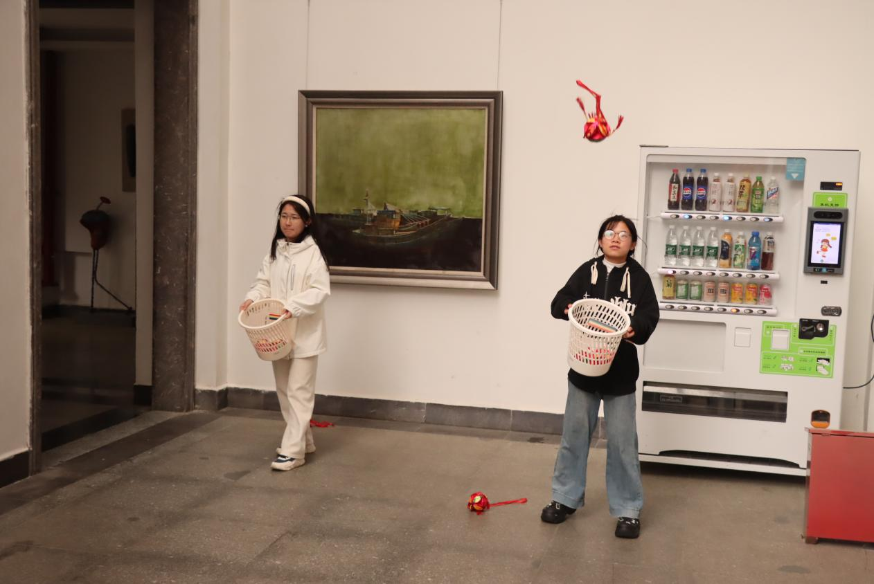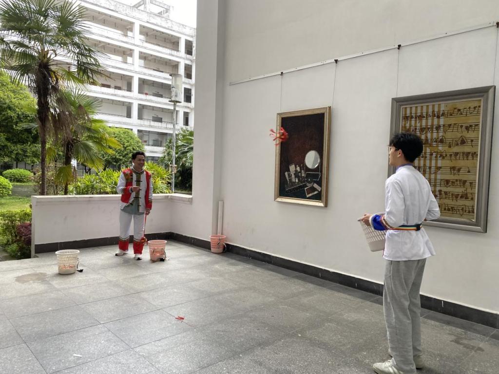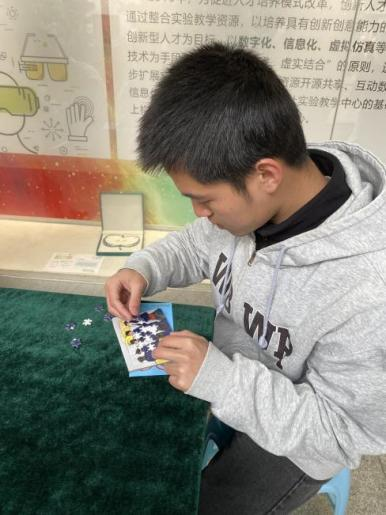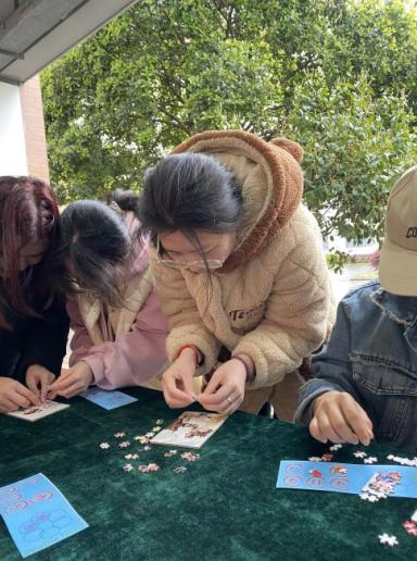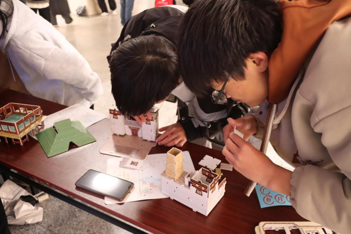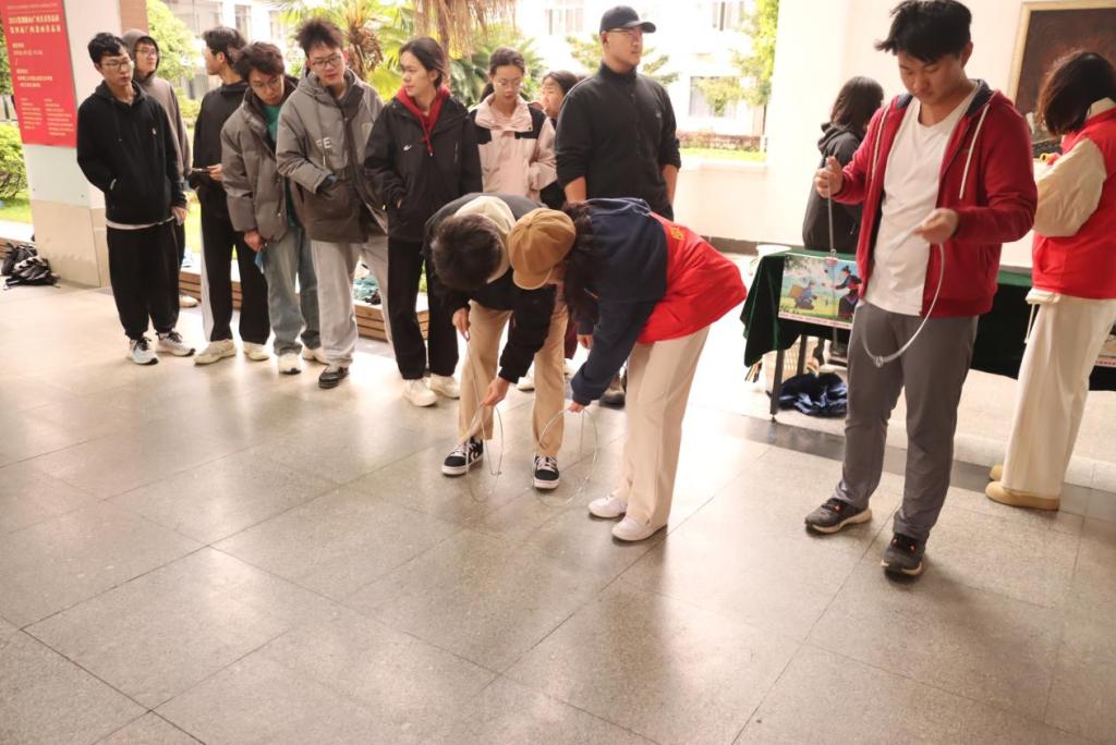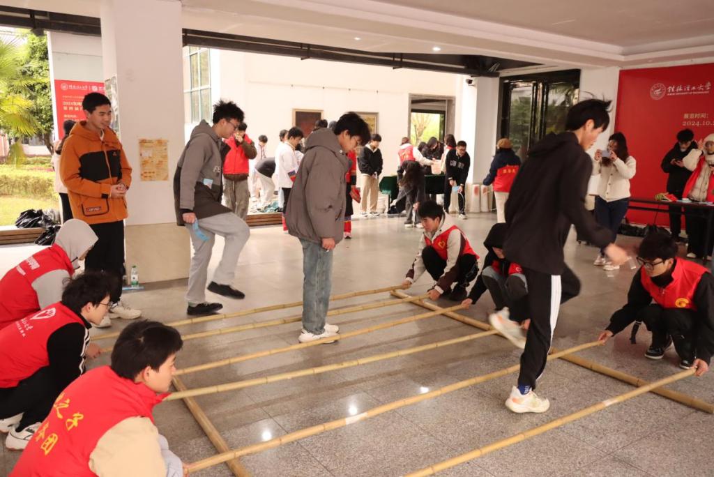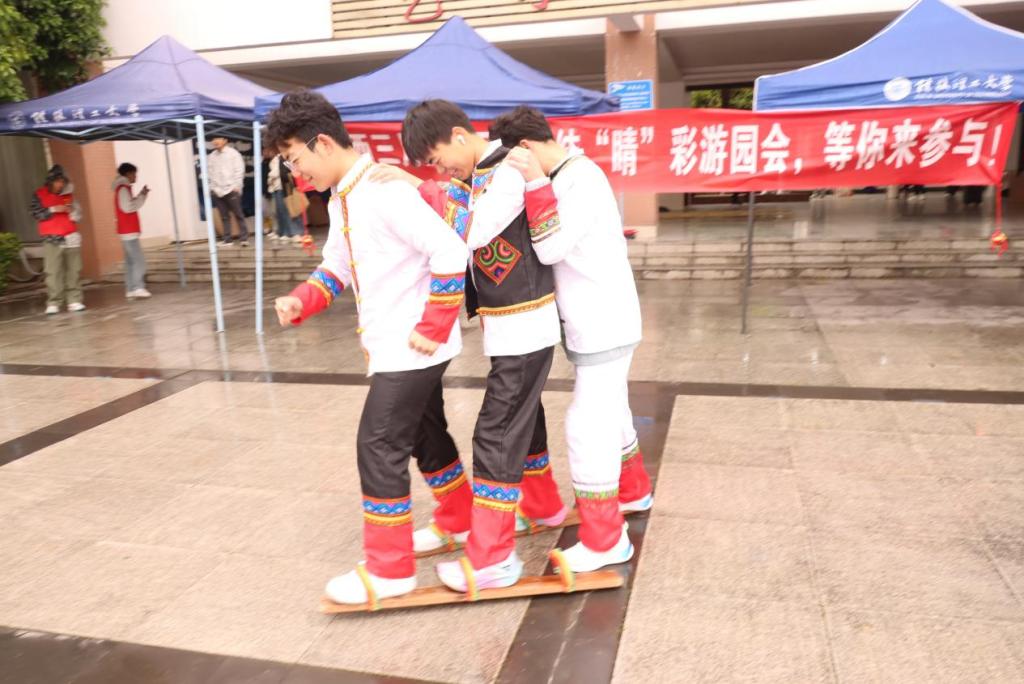 本次游园民俗体验活动设置了竹竿舞、抛绣球、射箭挑战、滚铁圈、走板鞋、民族元素拼图等六个项目,通过“文化体验+趣味竞技”的形式展开,吸引了200余名学生的热情参与。大家踩着音乐鼓点、伴随着竹竿开合节奏跳跃,展现了出色的协调能力;两人搭档,相互配合,将绣球精准抛入背篓;开弓、瞄准、脱弦,一气呵成,让箭矢直奔靶心;三人成队,共同驾驭板鞋,喊着“一二一”,在赛道上穿梭;一人或两人,认真观察摸索,每一盒积木都仿佛承载着一个民族的故事,各个民族最具代表性的元素被巧妙地浓缩进这些方寸大小的积木组件之中,“这看起来像苗族的图腾,你看它和旁边这个银饰图案的积木组合起来,就是苗族盛装出行的画面。” 同学们就这样你一言我一语,知识在互动中碰撞出火花。
