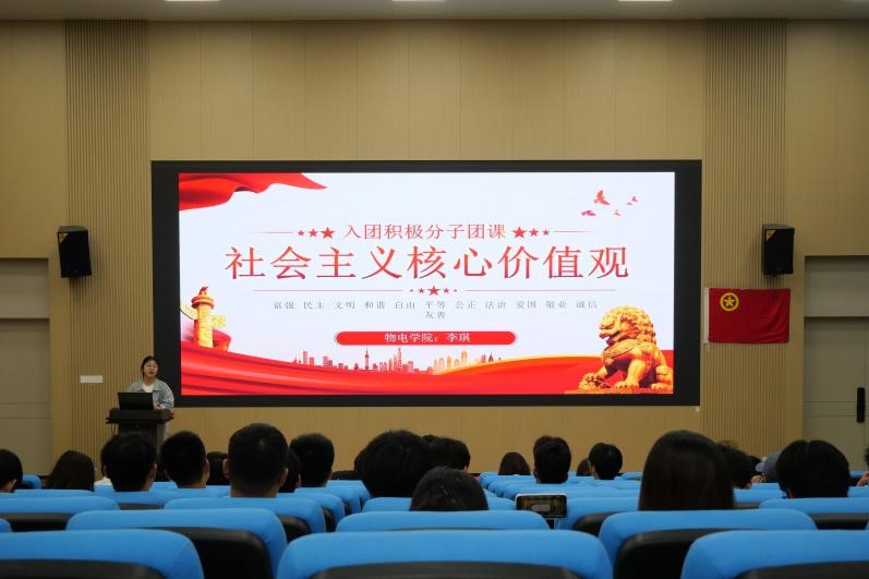 数统学院团委书记李艮老师以共青团的团章为切入点,深入阐述了如何成为一名合格的共青团员。随后,艺术学院团委副书记(主持工作)梁璇老师和计算机学院团委副书记蔡志勇老师分别就五四精神和党领导下的中国青年运动史作详细介绍,不仅加深了同学们对共青团奋斗史的理解,也进一步激发了他们的爱国热情。最后,物电学院李琪老师结合实际案例,对“社会主义核心价值观”进行深入浅出的讲授,引导全体学员加强团员意识、严格团的纪律。