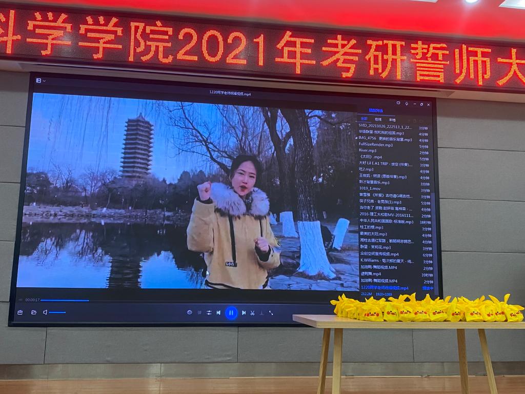 大会伊始,首先播放了往届优秀考研上岸的校友为同学们准备的加油和考研指导的视频,携手为2022考研学子送上祝福,句里行间流露出来的是对于2022考研学子美好真切的祝愿。