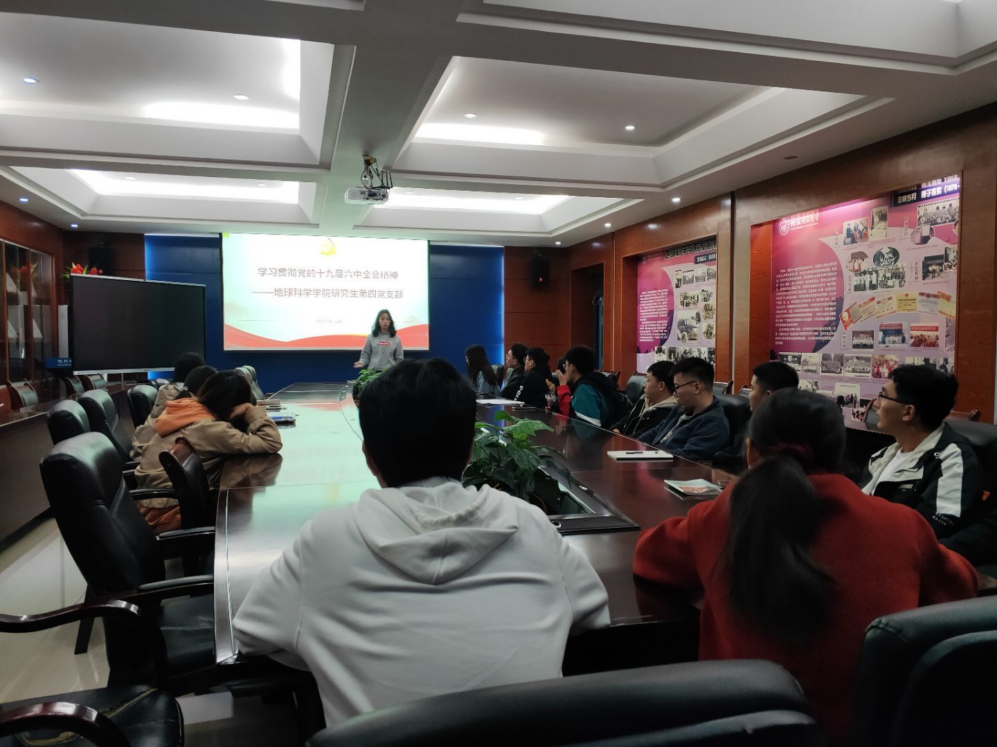 1128日,研究生第四党支部在逸夫楼01215会议室组织全体党员开展了“学习贯彻党的十九届六中全会和廉洁教育”主题党日活动。本次主题活动由支部书记周密同志主持,其余学生党员共同学习。