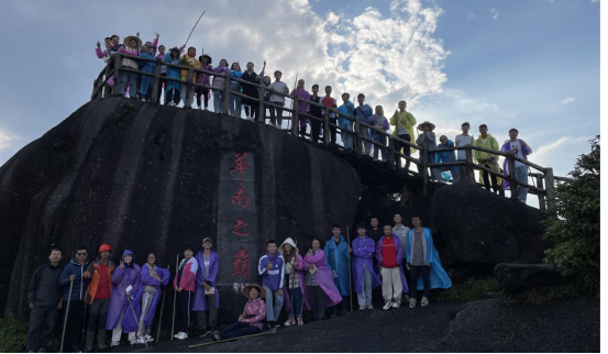 实习途中偶遇下雨,暂缓了我们登顶的脚步,考虑到学生的安全问题,我们只得稍事休息。可爱天公作美,一阵云海过后,渐渐雨势变小,同学们跃跃欲试,一边感叹大自然的鬼斧神工,一边不忘带上记录本向华南之巅出发。尽管登顶的道路因为刚才的小雨有些许的湿滑崎岖,但是沿途的风景却是美好绚丽的,特别是登顶过程中老师跟同学们的互相帮助,互相搀扶,更加深了师生友谊,构成了山间最美的风景。经过大家的不懈努力,我们终于到达上了华南的最高处,张桂林老师和李仁成老师分别就专业知识展开详细的讲解,尽管山上的风很大,但是同学们依旧纷纷拿出了自己的记录本认真记录,不负美景,不负知识,不负青春。