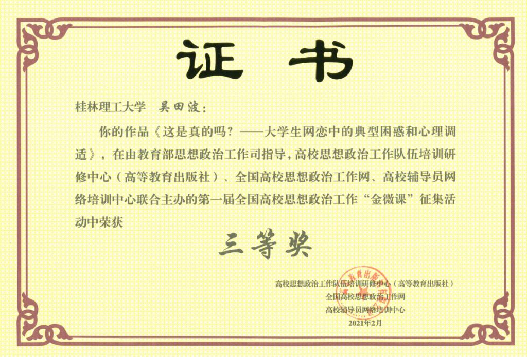 为引导打造一批有意义、有意思、有用处的高校思想政治工作“金微课”,在教育部思想政治工作司指导下,高校思想政治工作队伍培训研修中心(高等教育出版社)、全国高校思想政治工作网、高校辅导员网络培训中心联合举办了全国高校思想政治工作“金微课”征集活动。经专家评审,我院辅导员吴田波老师的作品《这是真的吗?--大学生网恋中的典型困惑和心理调适》荣获三等奖。