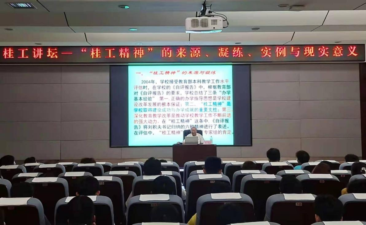528日晚我院于雁山校区逸夫楼01501报告厅举办桂工精神的来源凝练实例与现实意义主题讲座讲座由享受国务院政府特殊津贴专家欧阳成甫教授主讲,学院党委书记曹文献老师主持,各年级辅导员及学院青马班成员参