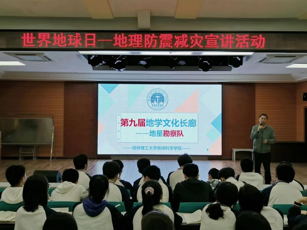 为进一步做好地学知识普及宣传工作,5月20号,bv伟德国际1946地星勘查队前往桂林市中山中学开展地理防震减灾宣讲活动。本次活动由地星勘查队代表宝石及材料工艺学20-1班杨娇同学、产品设计20-1班姚黎星同学主讲,200余名中山中学高一学子参加。