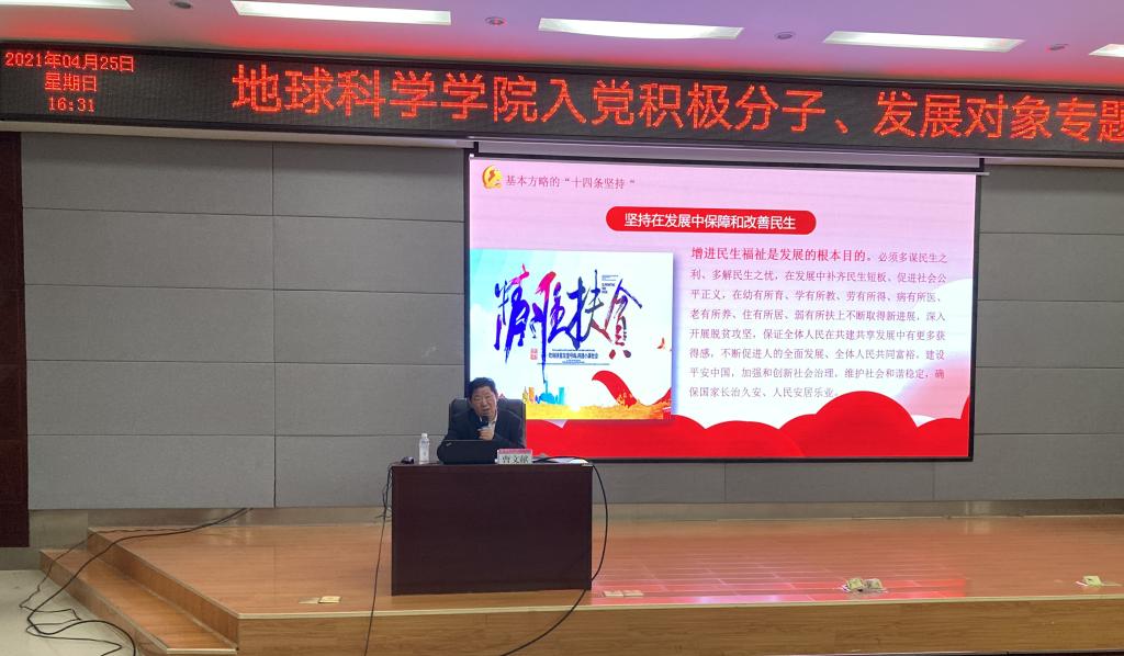本次党课培训,曹文献书记从习近平新时代中国特色社会主义思想的提出、基本方略的阐述、构成新时代坚持和发展中国特色社会主义的基本方略的“十四个坚持”以及学习习近平新时代中国特色社会主义思想的重大意义四个方面进行详细讲述。最后,曹书记指出,中国共产党历经百年风雨路,艰辛探索救国路,地学院全体学子应当积极向党组织靠拢,做到守初心、担使命,为实现中华民族伟大复兴的中国梦不懈奋斗。