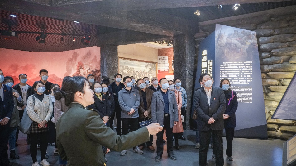 三月草长莺啼,苍树掩映的红军长征湘江战役纪念园庄严肃穆。党员同志在纪念馆认真聆听红军长征英雄事迹。