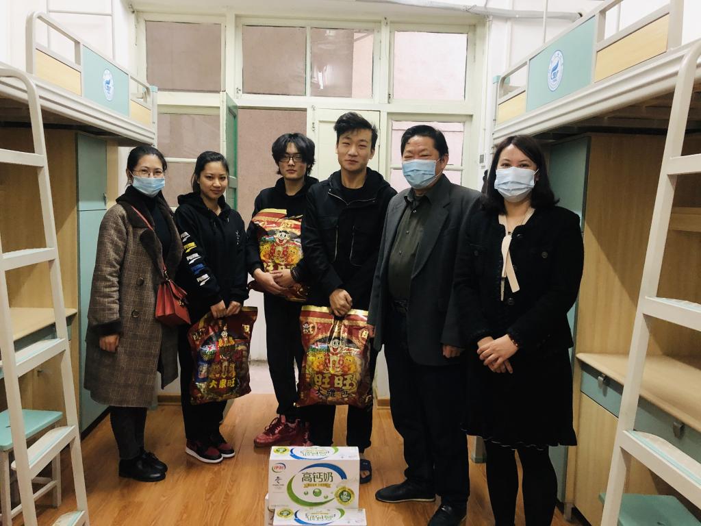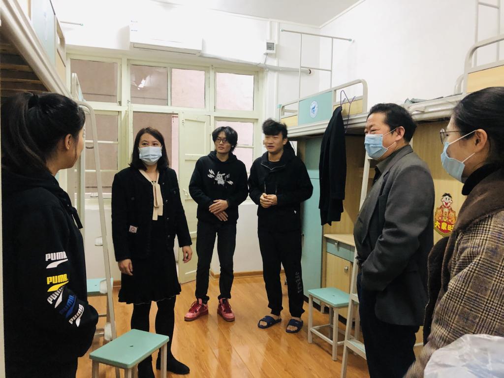 2021年2月8日上午,学院党委书记曹文献、党委副书记陶剑飞前往屏风校区6栋公寓看望慰问我院寒假留校学生,年级辅导员吕思慧陪同。