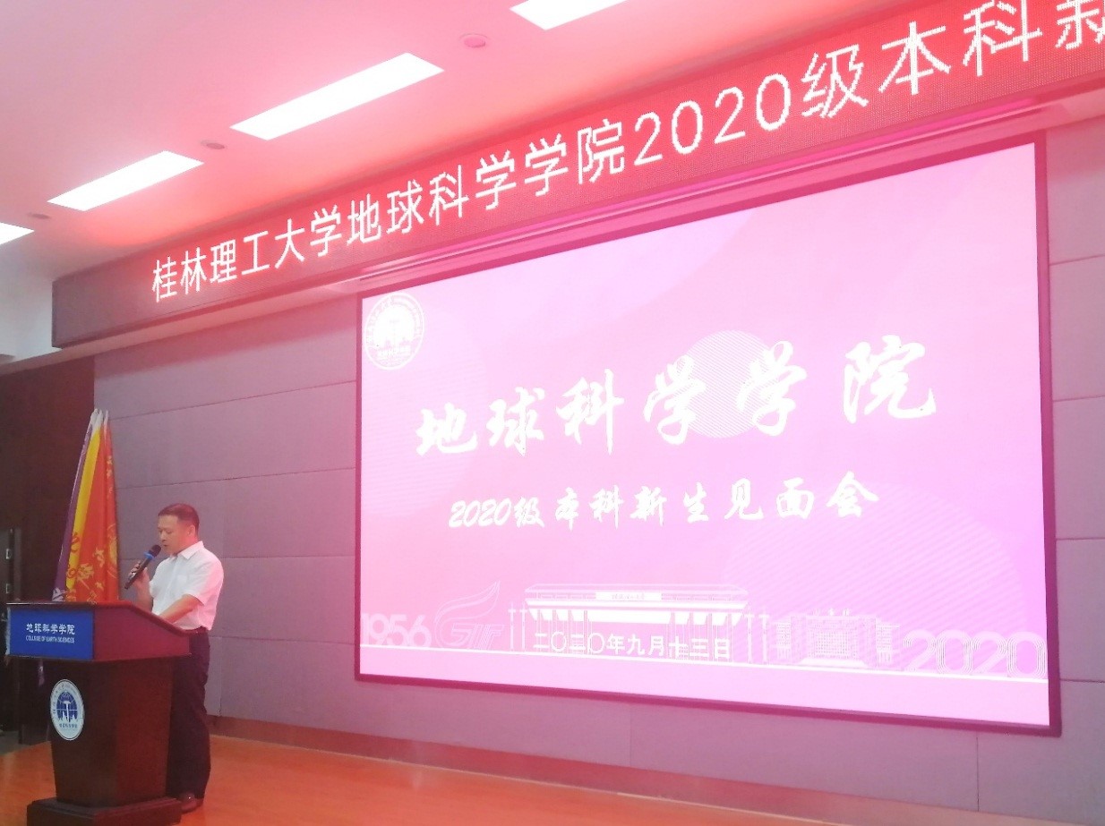 会议伊始,主持人介绍到会领导,全体师生奏唱国歌。会议第二项为学院党委书记曹文献致欢迎辞,曹书记在讲话中表示了他对全体新生的热烈欢迎与殷切期盼,希望新同学们能够适应大学生活,尽快融入地院这个大家庭。会议第三项为教师代表彭三曦老师,18级学生代表许塬浩,20级新生代表蒙权依次进行发言,他们为新同学们提供了宝贵的建议。会议第四项为学院常务副院长熊彬进行讲话,熊副院长对新同学们表示了热烈欢迎,介绍了本学院各专业特色与方向,并表达了对2020级新生们的高度期望,希望全体新生刻苦钻研,发扬地院精神。最后,曹书记和熊副院长为新生代表发放院徽和授旗,全体师生佩戴院徽,奏唱校歌,本次会议宣布结束。