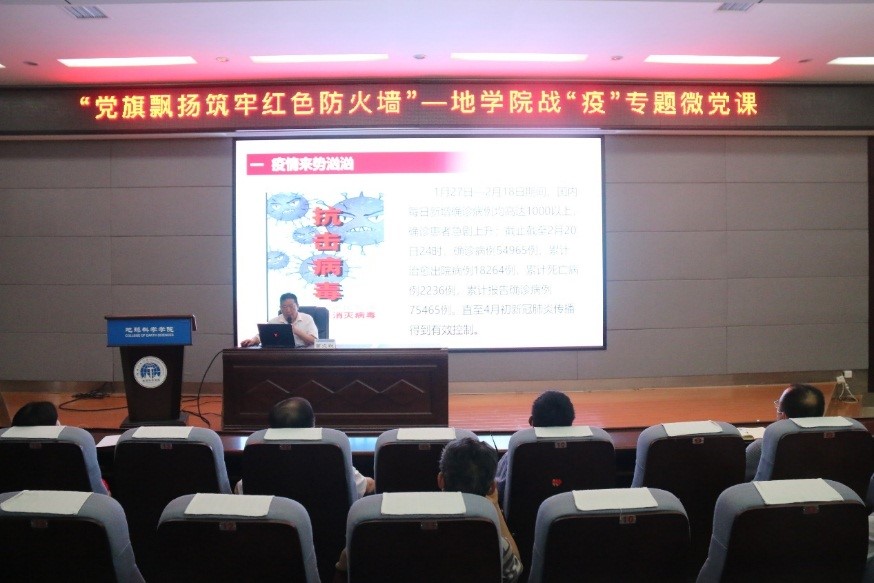 为强化疫情期间党员教育管理,充分发挥师生党员先锋模范带头作用,6月30日下午,我院党委书记曹文献在01501给全体师生党员讲授《让党旗始终高高飘扬,抓紧抓实抓细常态化疫情防控工作》战“疫”专题微党课。