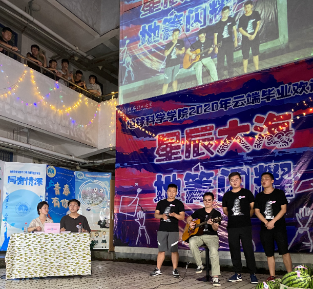 晚会分为“师恩难忘”、“同窗情深”、“青春有你”、“桂工有我”四个环节。晚会伊始,研究生代表进行开场表演,演唱歌曲《无人之岛+no fear in my heart+啊 朋友再见》,唱出了对老师、学弟学妹以及自己未来的美好祝福。接下来,各毕业生宿舍代表通过线上的形式依次为我们表演歌曲、舞蹈等节目。毕业班辅导员谷正杰为各毕业生宿舍送去了西瓜以及毕业美好祝福。随后,学院党委书记曹文献、院长许成、副院长吕玉增等老师通过视频的方式为毕业生送祝福。晚会最后,24栋宿舍楼全体师生合唱《伟德国际1946手机之歌》。晚会结束后,全体工作人员合影留念。