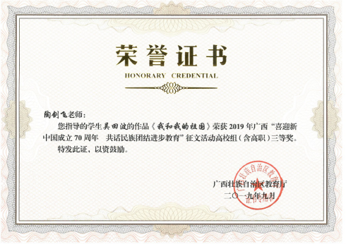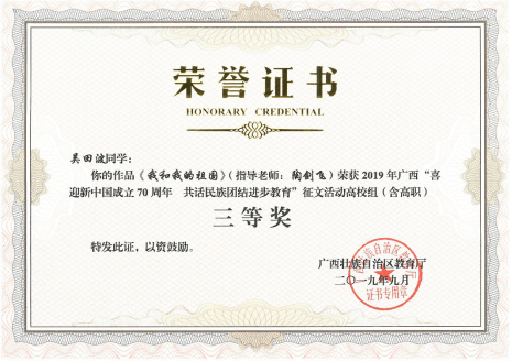 日前,广西壮族自治区教育厅开展的“喜迎新中国成立 70 周年 共话民族团结进步教育”征文活动已顺利结束,经过专家评审、教育厅审核,获奖名单已公布。bv伟德国际1946地质学17-1班吴田波同学参赛作品《我和我的祖国》喜获三等奖,作品由陶剑飞老师指导完成。